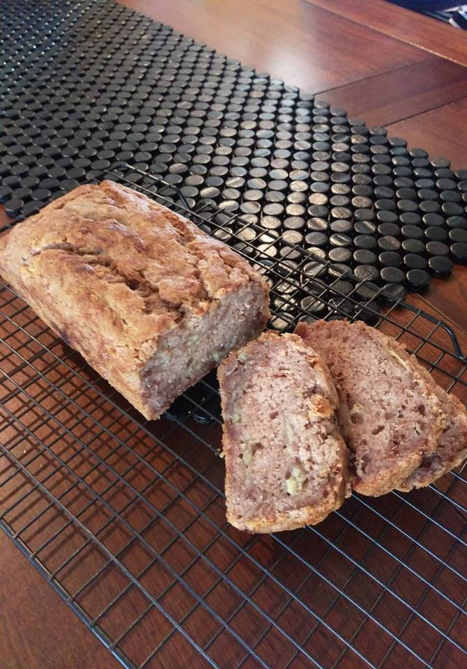 This recipe is egg free and I made a vegan version of the banana bread using soy milk. Walnuts can also be added. • 2 cups plain flour • 3/4 cups white sugar • 1/2 cup dark brown sugar • 3/4 teaspoon baking soda • 3/4 teaspoon salt • 3/4 teaspoon cinnamon • 1/2 cup milk • 2 cups mashed banana • 1/4 cup canola oil • 2 tablespoons maple syrup • 1 teaspoon vanilla extract 1. Sift together flour, sugars, baking soda, salt and cinnamon. 2. In another bowl mix together milk, banana, oil, maple syrup and vanilla extract. 3. Mix in the dry ingredients, until just combined. 4. Pour into a greased loaf tin and bake in a 175 degree preheated oven for an hour or until a skewer comes out clean after inserted.